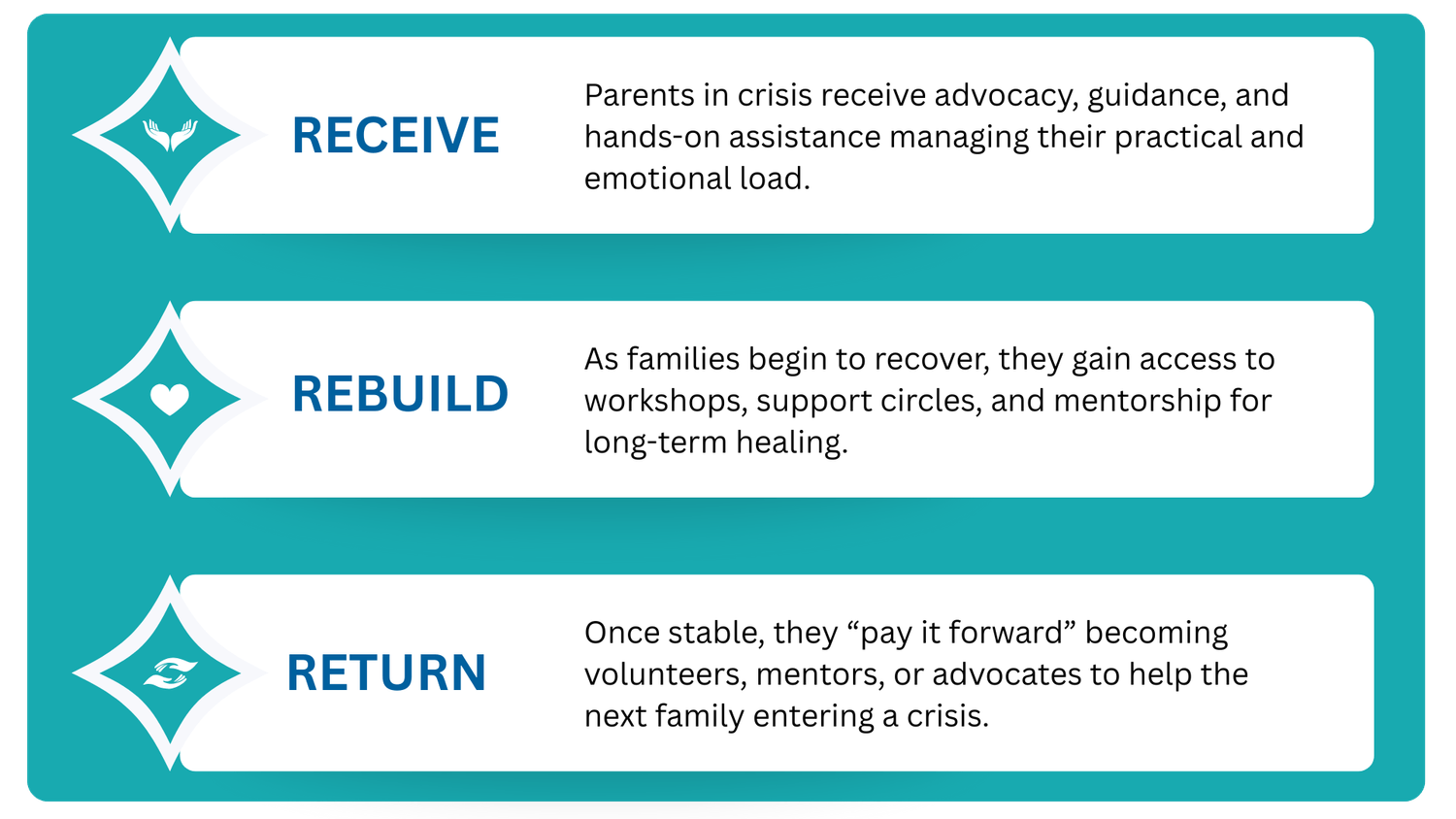 A world where every parent facing crisis is met with compassion, clarity, and community, and where those who have overcome hardship become a source of hope and guidance for others.